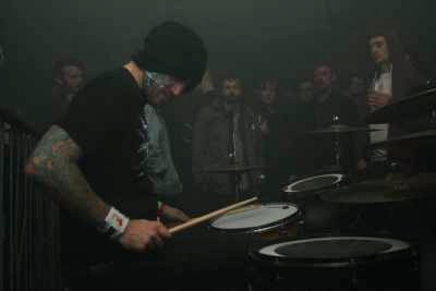 DRUNK IN HELL are drunk, well the scary lookign singer is anyway. Their repetitive guitar workouts have bored me before, but with a little beer they sound amazing. Top marks for lyrics by the way 'I'm an arsehole/I'm a fucking arsehole' always sounds good screamed down a mic over feedback and clattering drums. Cool.